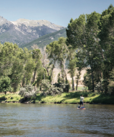 This is the Jefferson, just east of the Continental Divide. The river is shallow and slow, freeing us to fret about snakes and our plan to paddleboard 60 river-miles in just two days. But as the launch recedes behind us, so too does my worrying. Golden-green summer grass stretches across the valley and up the flanks of the Tobacco Roots to the east. Dark green forests drape the highlands, crowned by jagged rocky peaks. A cloudless sky, so perfectly blue it seems like a movie set, presides over the scene. For a couple of paddlers accustomed to western Montana’s tighter, more forested river valleys, the views seem almost too expansive. In the foreground, dense thickets of willow and bright-green stands of cottonwood dot the floodplain.