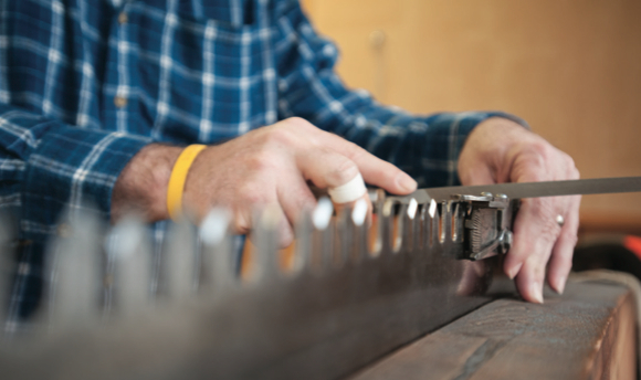 The sound of hammer striking metal ripples through the room. The air smells like WD-40 and metal shavings. A half-dozen folks stand upright behind long wooden racks, intent on the shiny metal saws affixed firmly to the tops of the handmade racks. We’ve discovered the crosscut saw sharpening class and are getting an introduction to another unique service that Ninemile offers.