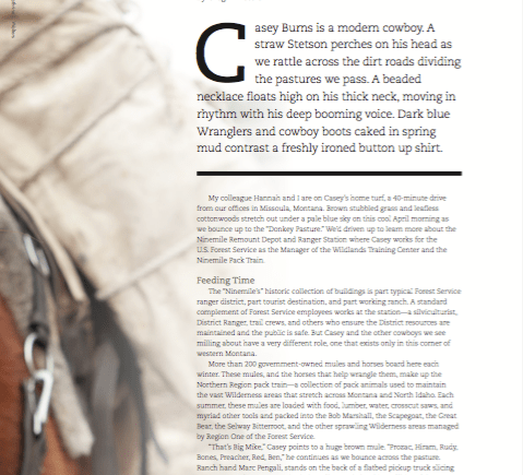 “Without Wilderness, we wouldn’t be here,” Casey tells me on the phone prior to our first meeting. “You can’t use a chainsaw in the Wilderness, and you can’t drive there either, so the mules and the crosscut saws are integral to our ability to maintain these areas.”